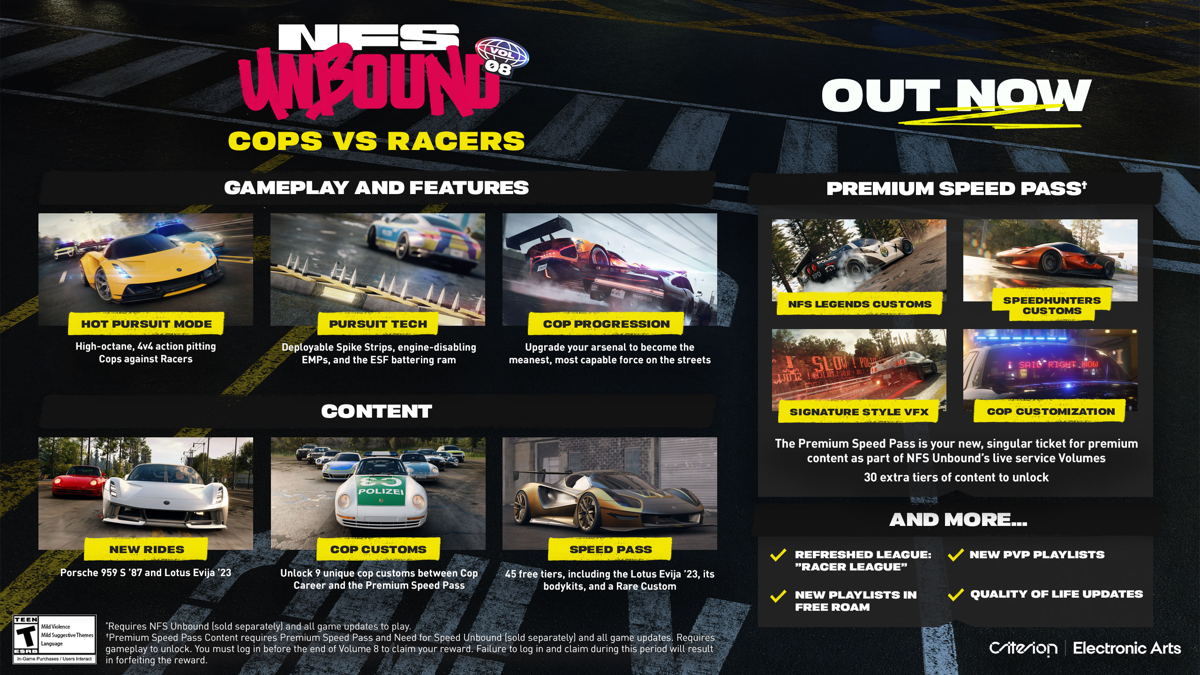 Electronic Arts et Criterion Games dévoilent aujourd'hui Need for Speed Unbound Vol. 8 : Flics vs. Pilotes, la nouvelle mise à jour du jeu. Lancé le 21 août sur PlayStation 5, Xbox Series X|S et PC, Vol. 8 continue d'offrir l'expérience Need for Speed ultime avec le retour du mode classique Poursuite infernale, directement inspiré de Need for Speed Hot Pursuit. Ce volume introduit la technologie de poursuite, la nouvelle progression de la police, ainsi que l'arrivée de l'emblématique Porsche 959 S (1987) et de la nouvelle Lotus Evija (2023), candidate au titre de méta-voiture.