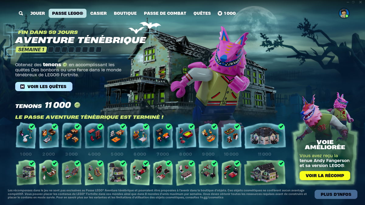 Le passe LEGO Aventure Ténébrique sera également disponible à partir du vendredi 11 octobre, parfait pour la saison d'Halloween. Les joueuses et joueurs pourront débloquer des récompenses dans le jeu et réaliser la création la plus effrayante qui soit avec dix ensembles de décorations qui pourront être gagnés via le parcours de récompenses gratuit. Il sera également possible de débloquer des récompenses dans le jeu grâce au parcours de récompenses Premium achetable.