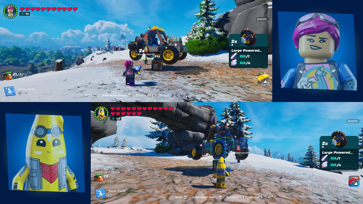 Les joueuses et joueurs du monde entier pourront désormais partager leur expérience LEGO Fortnite avec un membre de leur famille ou un·e ami·e grâce au nouveau mode écran partagé de LEGO Fortnite. En mode écran partagé, deux personnes pourront explorer ensemble le monde de LEGO Fortnite et construire des villages tout en jouant sur la même console PlayStation 4, PlayStation 5, Xbox One ou Xbox Series X|S, depuis la même pièce.