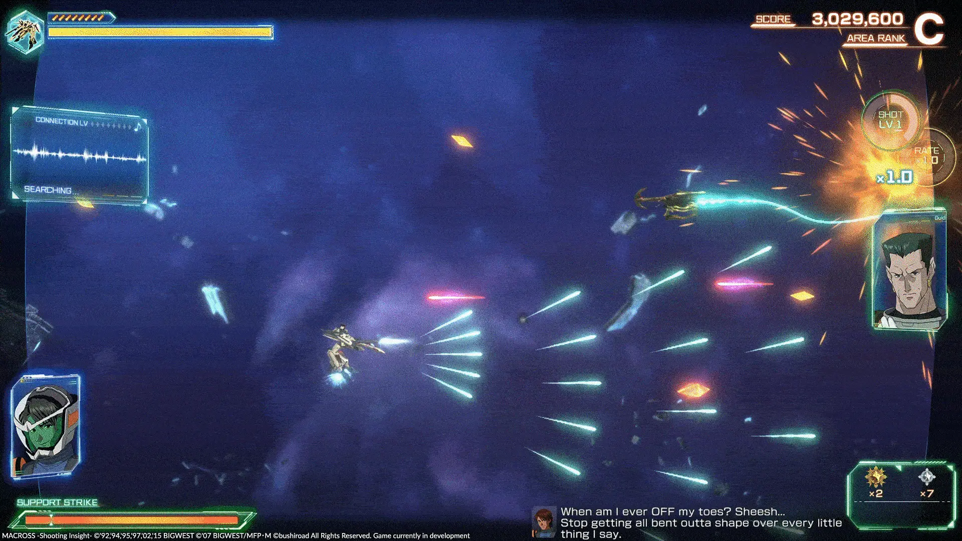 Contrairement à d’autres jeux du genre, MACROSS -Shooting Insight- propose une narration poussée, avec de nombreuses séquences de dialogue. Ce choix renforce l’immersion, mais on regrette l’absence d’un mode deux joueurs, pourtant apprécié dans les shoot’em up classiques.